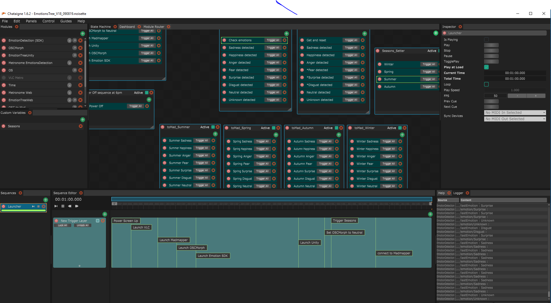 Il utilise le logiciel Châtaigne pour la conduite interactive de l’installation : c’est en quelque sorte le chef d’orchestre qui se charge de mêler les différentes interfaces logicielles et matérielles.