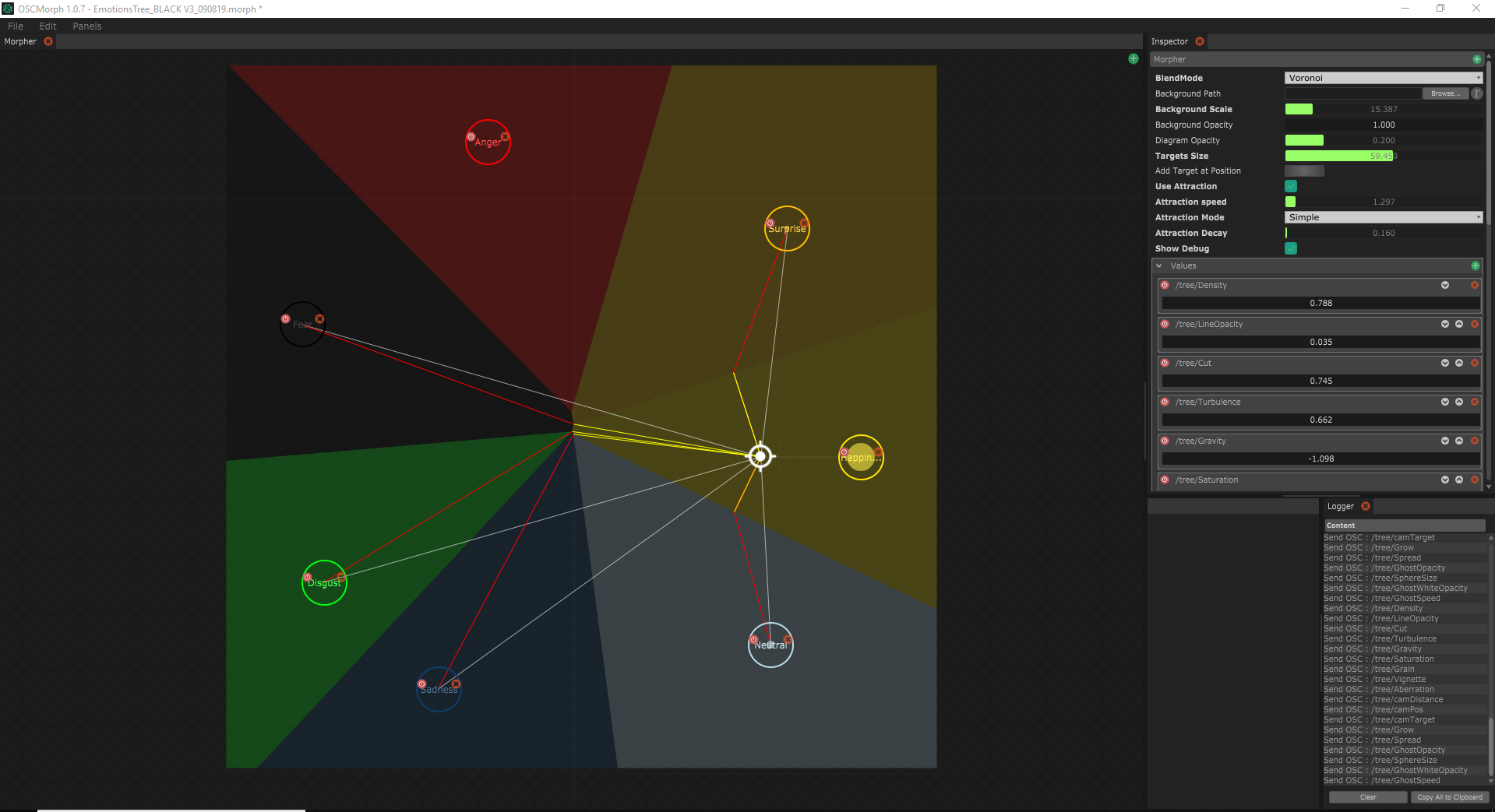 Le logiciel OSCMorph transforme les émotions reçues par le système de reconnaissance faciale ( kit de développement (SDK) de la société Neurotechnology) ainsi que le site web en « attracteurs ». En effet, chaque émotion captée représente une unité d’attraction.